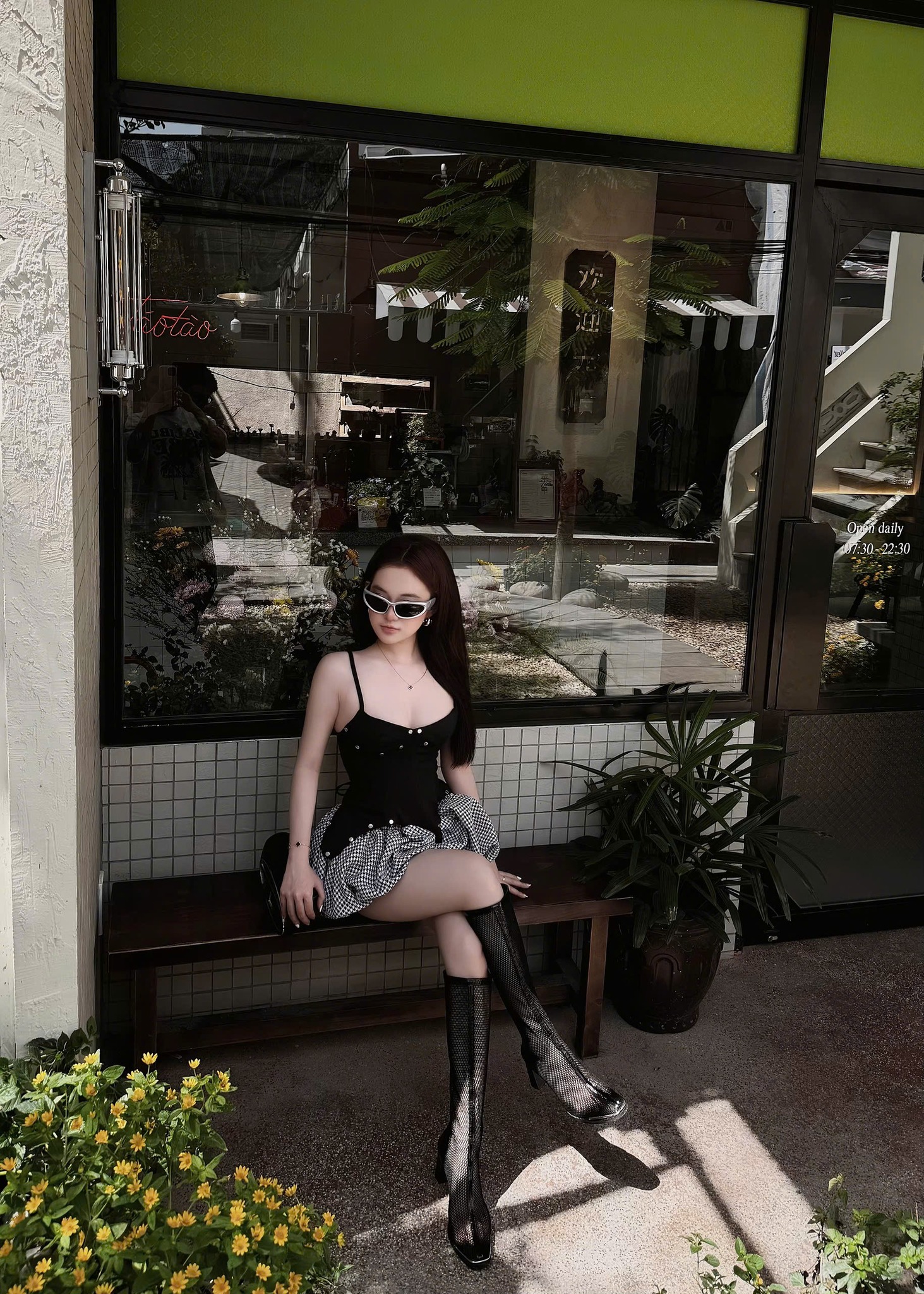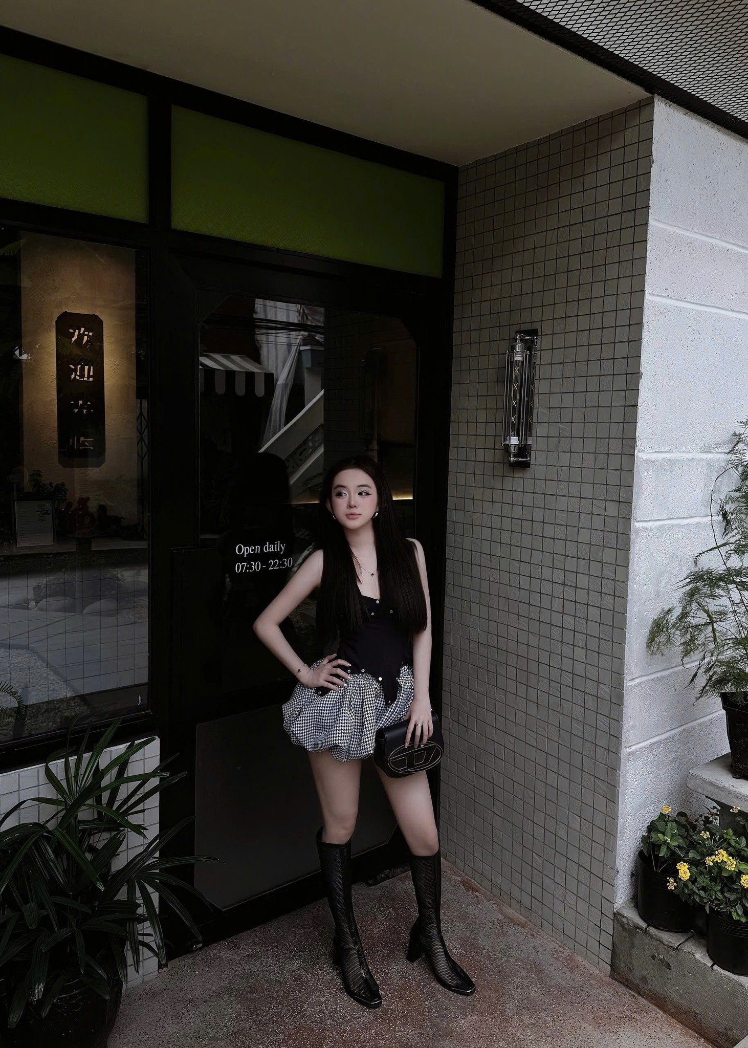 - Design: Sleek black spaghetti-strap corset top paired with a playful black-and-white gingham bubble skirt.