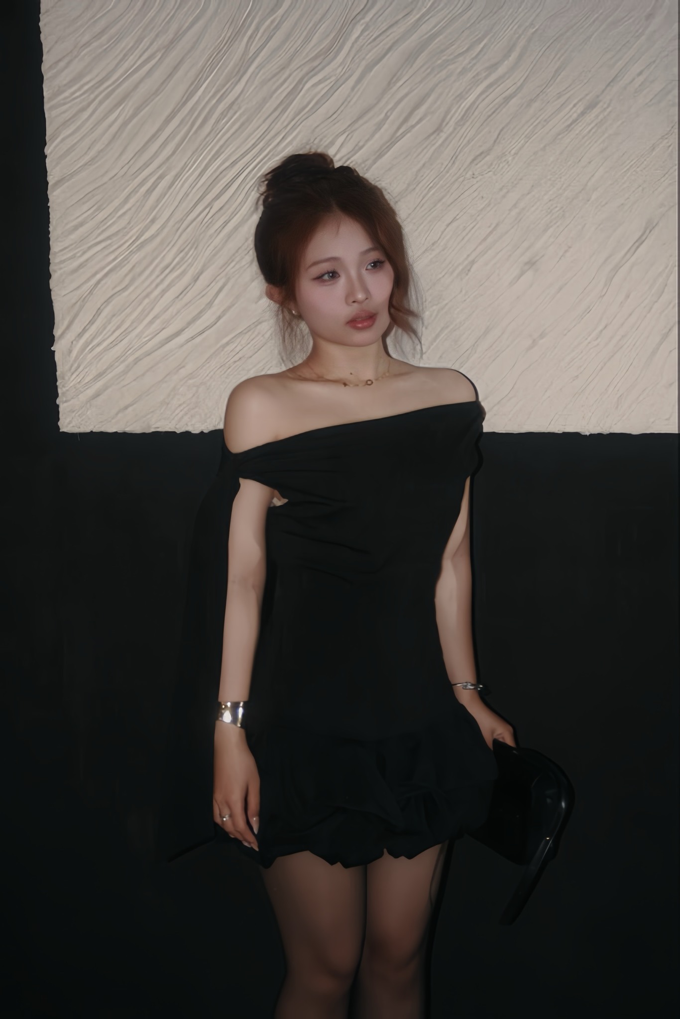 - Design: Off-shoulder silhouette paired with a unique bubble-textured mini skirt for a sculpted, statement-making shape.