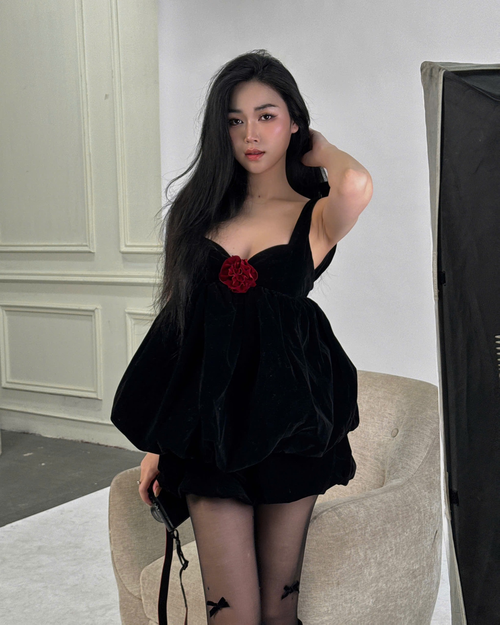 Velvet Black Mini Dress with Red Rose Detail – Romantic Evening Elegance